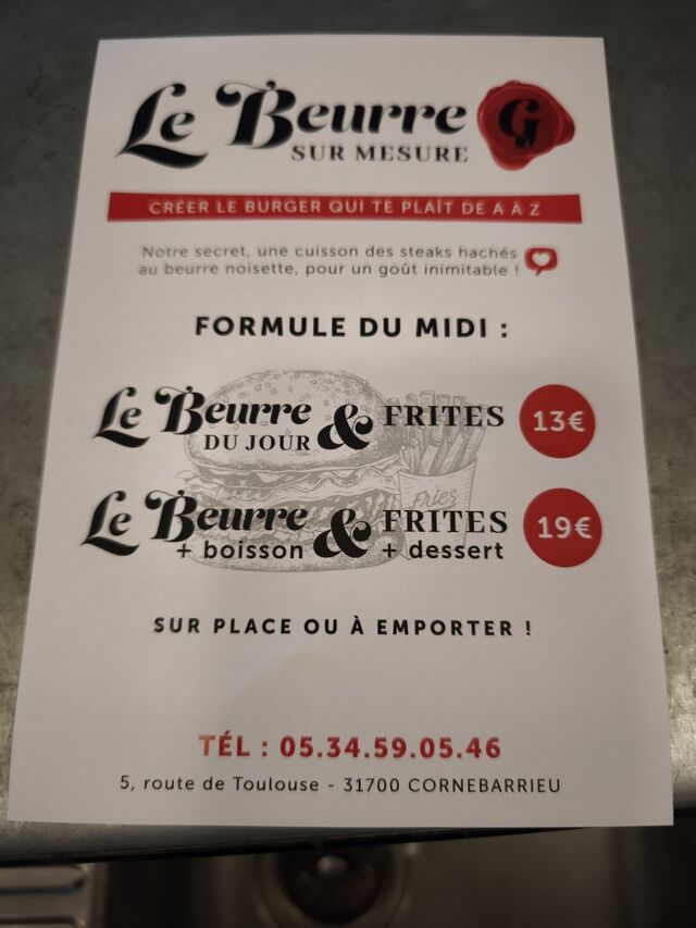 CALL +33534590546Dans votre restaurant le Beurre G sur mesure venez profiter d'une ambiance décontractée et chaleureuse.